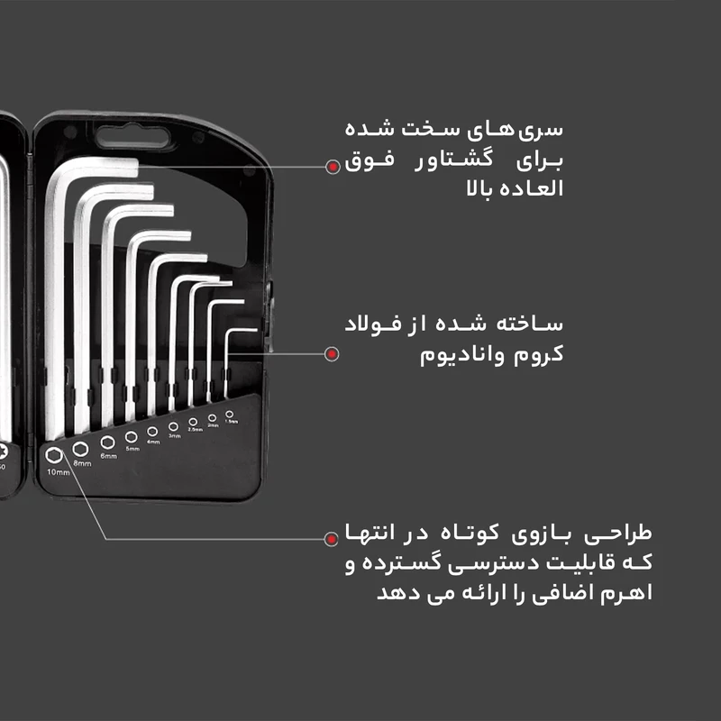 - ۹ عدد آچار آلن در سایزهای ۱.۵، ۲، ۲.۵، ۳، ۴، ۵، ۶، ۸ و ۱۰ میلیمتر - ۹ عدد آچار ستارهای درسایزهای T۱۰، T۱۵، T۲۰، T۲۵، T۲۷، T۳۰، T۴۰، T۴۵ و T۵۰ - قابلیت آویزان کردن قاب نگهدارنده - آچارهای با زاویه ۹۰ درجه